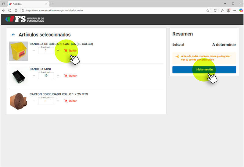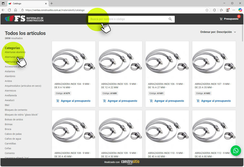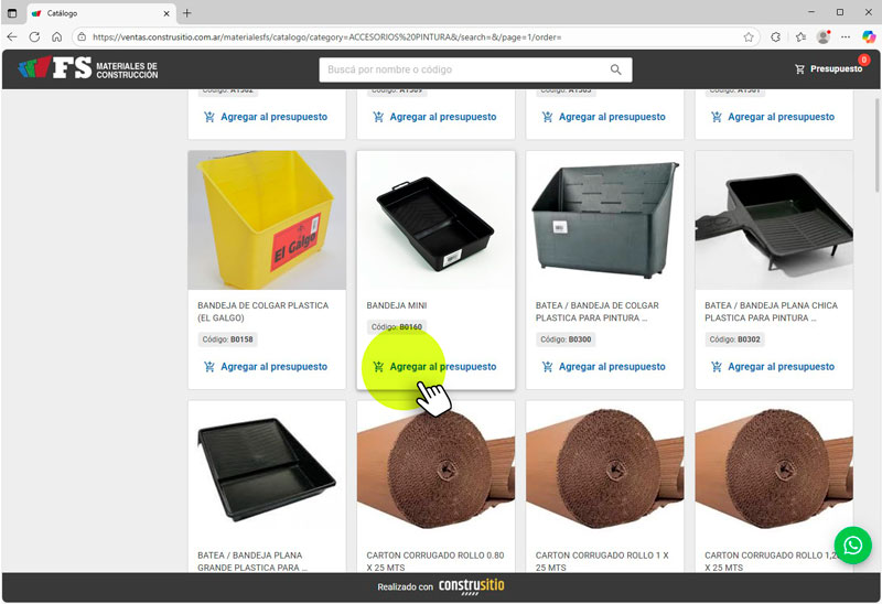 Tutorial para clientes Cómo realizar presupuestos desde el catálogo de Construsitio 1. Ingreso al catálogoComo cliente podés acceder al CATÁLOGO directamente desde nuestro sitio web, sin necesidad de iniciar sesión. 2. Búsqueda de productosConstrusitio ofrece dos formas de encontrar artículos:Búsqueda por aproximación: Ingresá el artículo que buscás por nombre o marca.Filtros por categoría: ideal para explorar por rubros, tipos de productos o familias. 3. Agregar productos al carritoCada artículo puede agregarse al carrito con un clic. Se abrirá una ventana emergente en la que podrás indicar la cantidad antes de continuar. 4. Revisar el carritoAl ingresar al carrito, podrás ver:Los artículos seleccionados.Modificar la cantidad.Eliminar el artículo.Para completar el pedido, deberás iniciar sesión. 5. Finalizar pedidoAl Iniciar sesión ingresarás al panel de pedidos/presupuestos. Si deseás volver al catálogo, deberás hacerlo desde el menú de navegación. PEDIR PRESUPUESTO